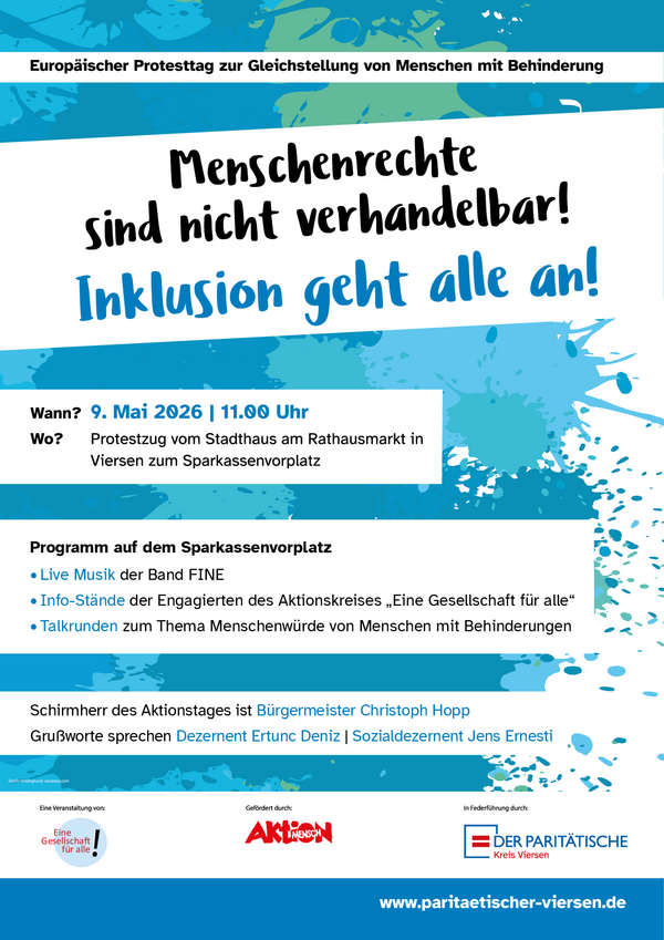 Der Paritätische NRW, KG Viersen, lädt im Namen des Arbeitskreises für Behindertenfragen unter dem Motto "Menschenrechte sind nicht verhandelbar" zu einem Protestzug vom Stadthaus am Rathausmarkt zum Sparkassenvorplatz in Viersen ein.